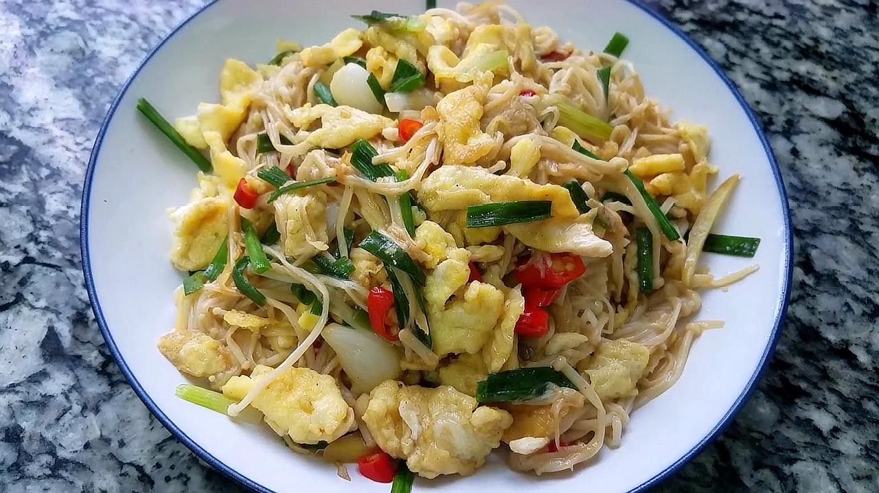 3大火翻炒,加入盐鸡精 金针菇炒软,即可出锅了金针菇炒鸡蛋 材料金针菇,鸡蛋23个,葱,蒜,盐,鸡精,生抽 准备工作金针菇洗净去底对半切,鸡蛋打散放入少量盐,大葱切段,蒜切末 制作步骤 1冷油入锅,倒入鸡蛋,翻炒后盛出 2另起锅,倒油,放入葱蒜爆香 3下金针。